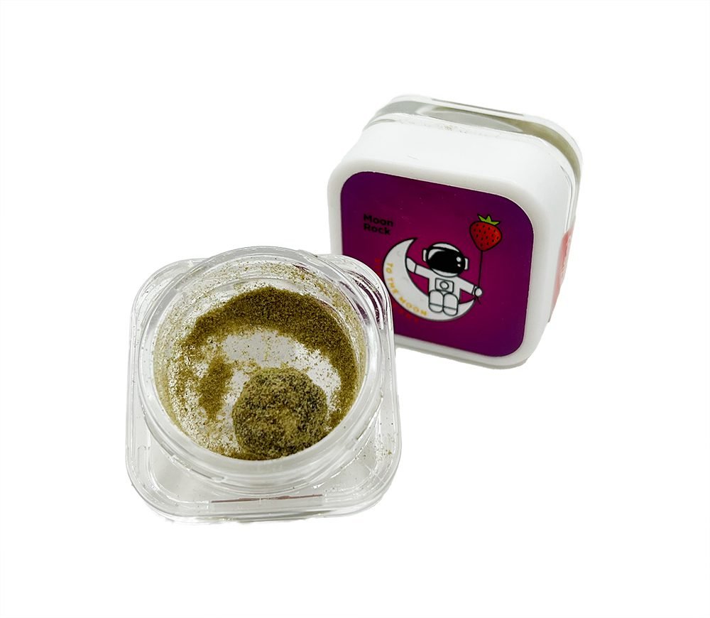 With To the Moon’s Moon Rock 1g in Strawberry flavor, an exquisite blend of AAAA grade Cannabis flowers carefully dipped in 99.99% delta-9-tetrahydrocannabinol distillate, you may go on an extraterrestrial adventure. These Moon Rocks, which are expertly rolled and covered in high-quality kief, offer an unmatched experience that goes beyond the typical.